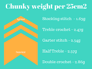 Three results were consistent throughout my study. Stocking stitch was the lightest, treble crochet was next and double crochet was always the heaviest.